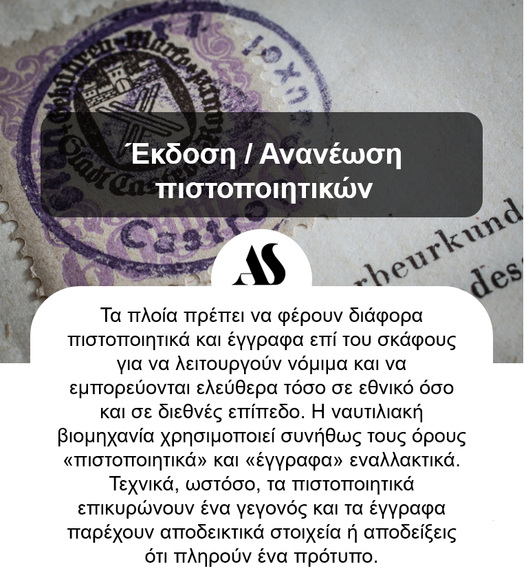 Σήμερα, η ναυτιλία είναι η σημαντικότερη βιομηχανία της χώρας και καθώς ο ναυτιλιακός κλάδος ρυθμίζεται όλο και περισσότερο, είναι ζωτικής σημασίας η επιχείρησή σας να διασφαλίζει ότι τα πλοία και το φορτίο της συμμορφώνονται με τους σχετικούς κανονισμούς και είναι ασφαλή για τους ενδιαφερόμενους και το περιβάλλον. Η αφοσιωμένη και έμπειρη ομάδα μας είναι έτοιμη να σας βοηθήσει και να σας παρέχει υπηρεσίες για σκάφη επαγγελματικά και αναψυχής σε πλήρη συμφωνία με τις ισχύουσες διατάξεις των Εθνικών και Διεθνών Κανονισμών.